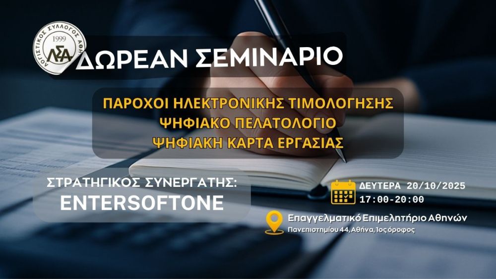 20.10.2025 Σεμινάριο Δια Ζώσης στο ΕΕΑ: Πάροχοι Ηλεκτρονικής Τιμολόγησης-Ψηφιακό Πελατολόγιο & Παραστατικά Διακίνησης-Ψηφιακή Κάρτα Εργασίας
